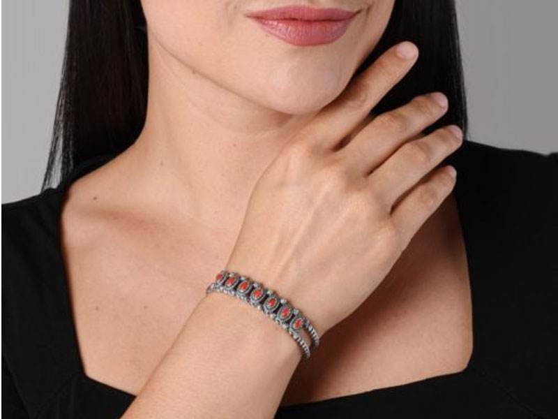 - Double twisted rope and floral motif holds 7 oval Red Coral Gemstone cabochons in serrated bezel-settings across the top of this cuff bracelet. Polished and oxidized finish shows off all the detail of craftsmanship.