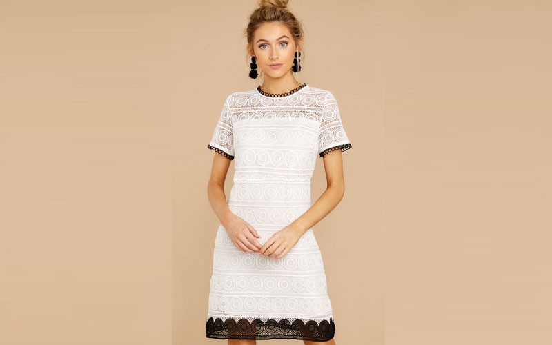 - Lace dress features tunic silhouette, a round neck with straight illusion neckline, short sleeves 8.5" in length, and circular ladder lace trim.