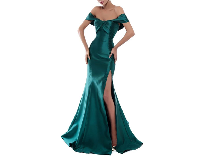 - Details: Off-shoulder sleeves, Taffeta, Fitted bodice, Mermaid skirt, Front slit, Pleated bodice